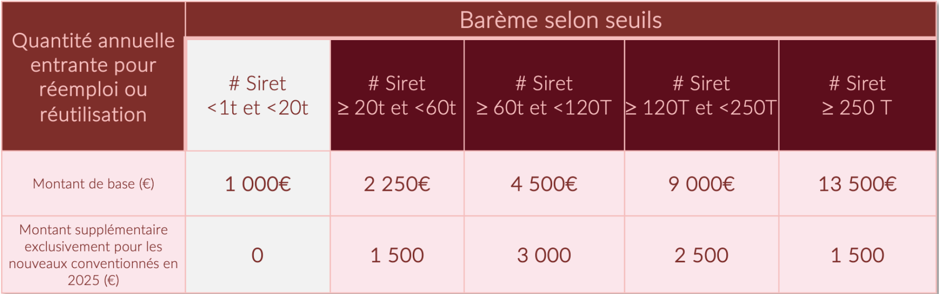 Le soutien est calculé selon un barème forfaitaire basé sur les tonnages de TLC entrants tracés pour réemploi. Plus vous tracez de volumes, plus le soutien est important.