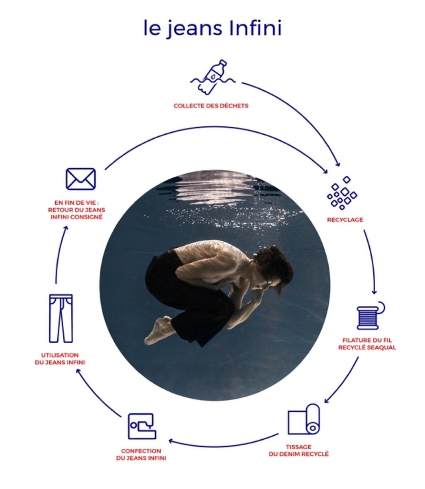 The Infini range was developed because we wanted to produce the very first range of jeans while thinking about end of life from the conception step. Classic jeans are complex products to recycle because they comprise hard points and a multitude of materials: cotton, elastane, etc. To create a pair of jeans that can be efficiently recycled we decided that our Infini jeans would contain a single material, 100% polyester.