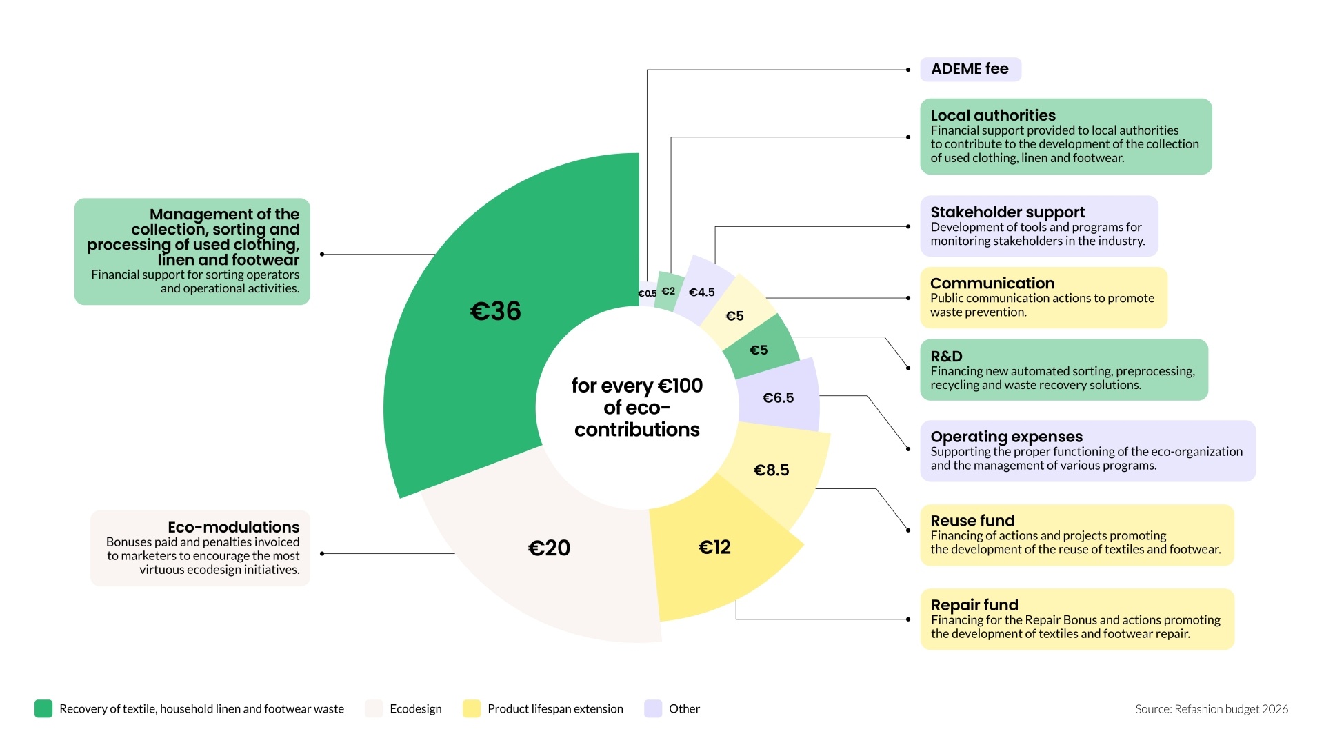 Each year, Refashion assesses the funding required to carry out its missions and achieve its objectives. Based on this evaluation, an amount is determined with our board of directors and then submitted to the stakeholders’ committee and the public authorities. This process constitutes the eco-fee funding call.
