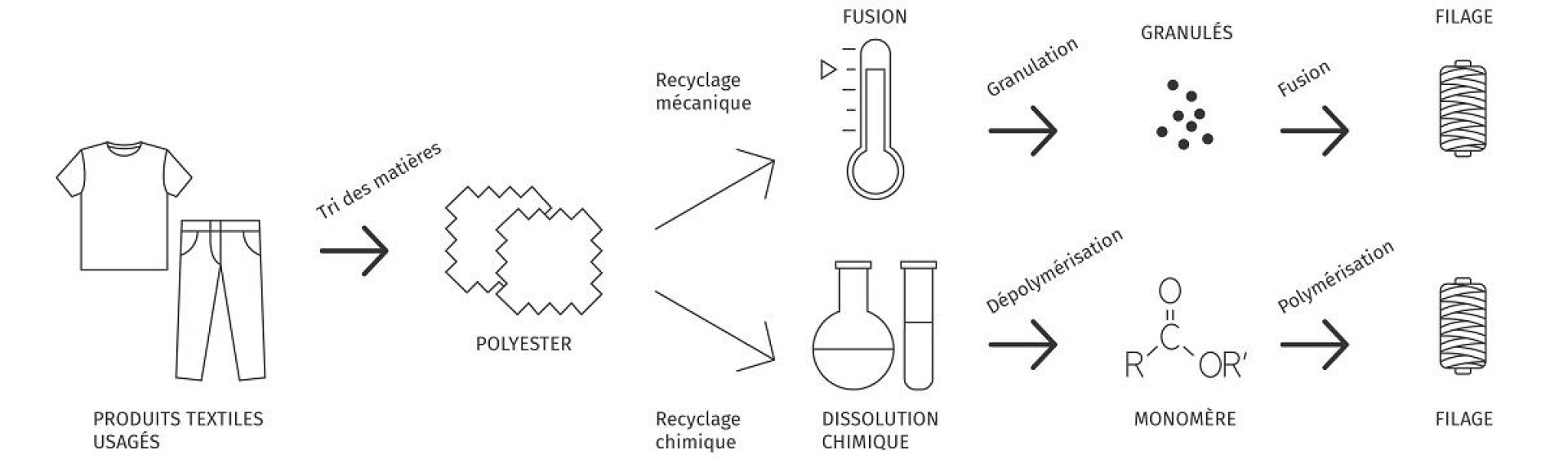 Le polyester recyclé peut être issu du recyclage de vêtements usagés (dit post-consumer) ou bien de chutes de production (dit pre-consumer). Le polyester peut être recyclé aussi bien mécaniquement que chimiquement. En plus d’être utilisé pour récréer du fil, le polyester recyclé a de nombreux débouchés: la plasturgie, les non-tissés ou bien les combustibles.