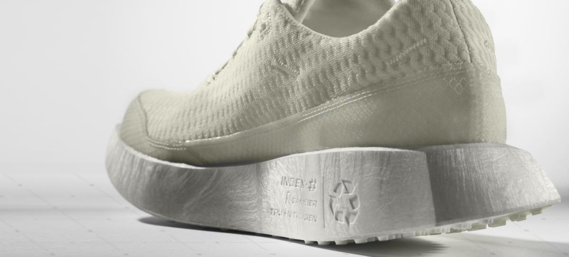 L’objectif était de conserver le plus possible la pureté de chacune des matières pour faciliter leur recyclage. Nous avons donc isolé et localisé très distinctement le TPU et le polyester sur la chaussure, ils sont ainsi plus faciles à séparer et trier. Toute la partie sous le pied est en TPU et toute la partie chaussante supérieure est en polyester et séparable au ciseau.